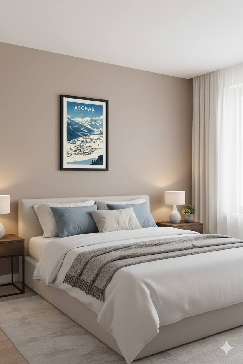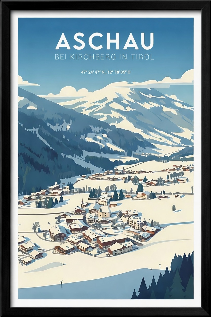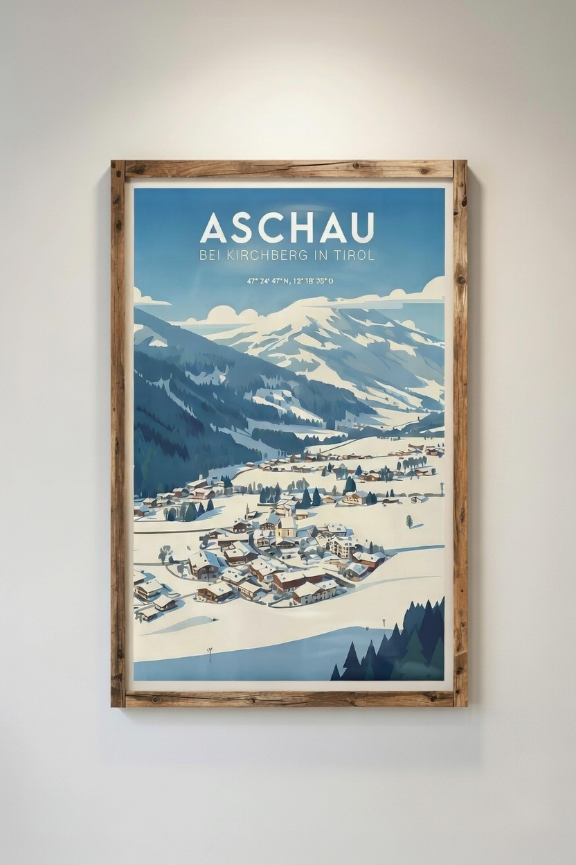 Vintage Poster Aschau Kirchberg in Tirol. Retro Stil. Erhältlich als Poster mit handgemachten Altholzrahmen oder Fichte Schwarz.