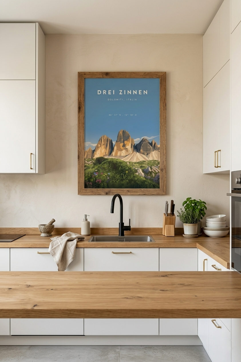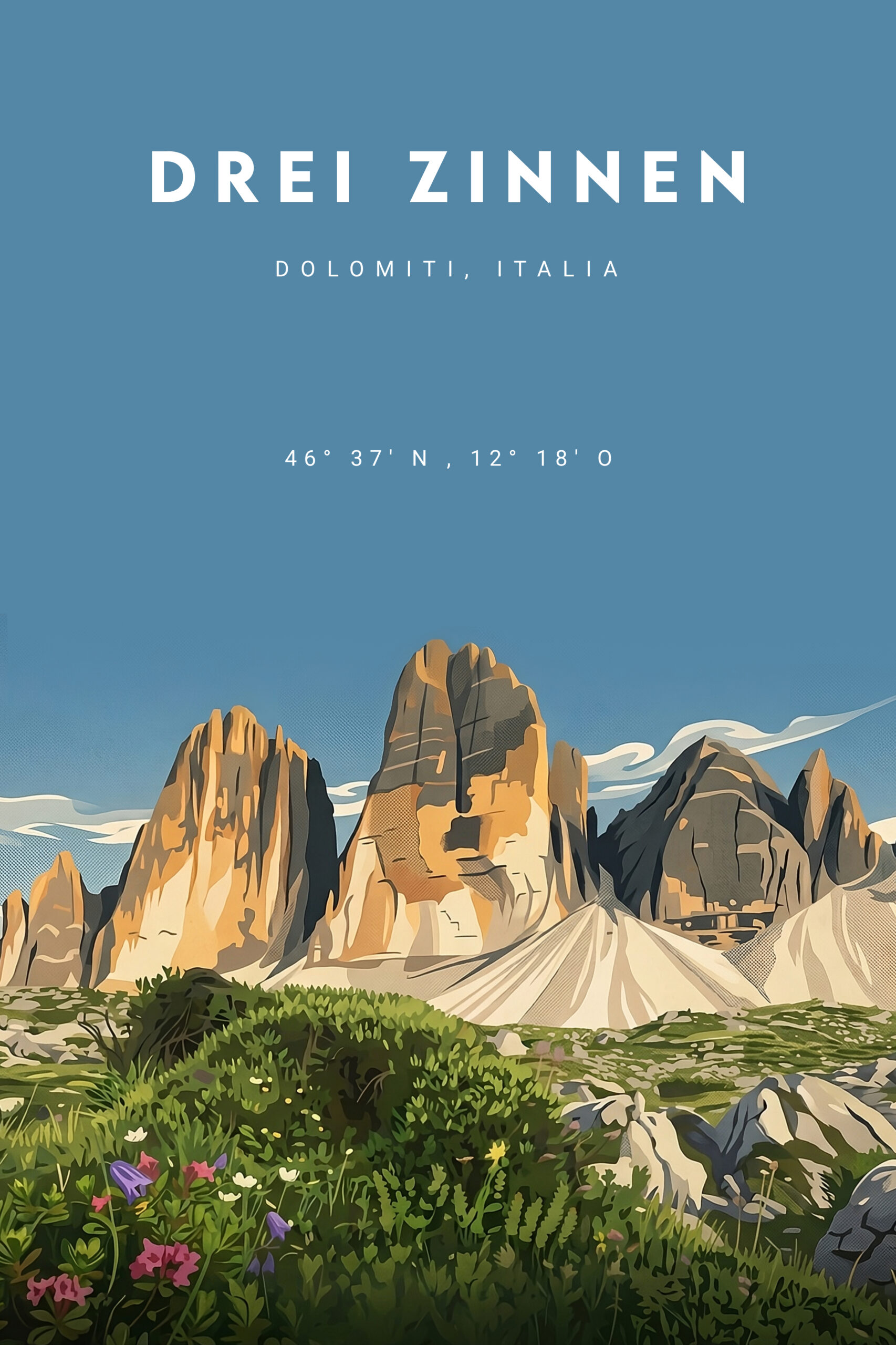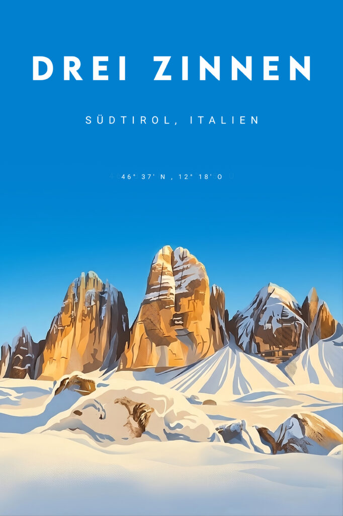 Vintage Poster Drei Zinnen im Retro Stil. Erhältlich als Poster mit handgemachten Altholzrahmen oder Fichte Schwarz.