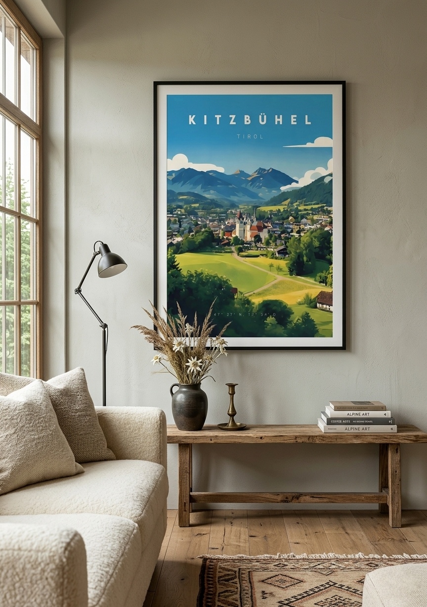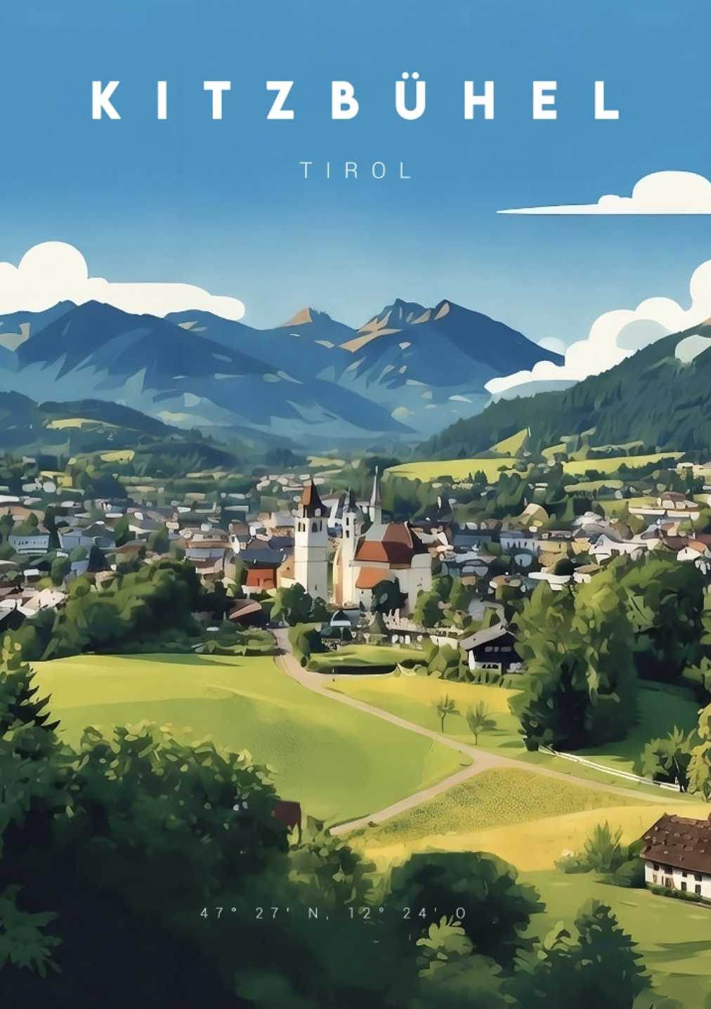 Vintage Poster Kitzbühel mit Kirchen und Altstadt. Retro Stil. Erhältlich als Poster mit handgemachten Altholzrahmen oder Fichte Schwarz.