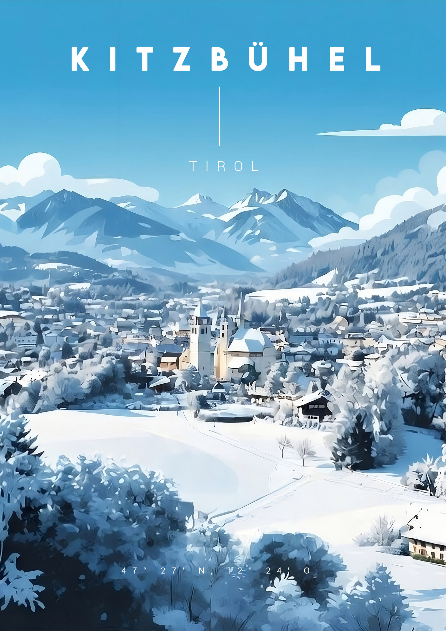 Vintage Poster Kitzbühel im Winter mit Kirchen und Altstadt. Retro Stil. Erhältlich als Poster mit handgemachten Altholzrahmen oder Fichte Schwarz.